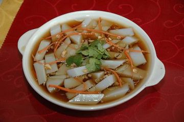 3.将荞麦淀粉加水和成面团,蘸水扎软,边加水边扎,直至搅成稀糊糊。约500克淀粉需加水2000克左右,然后将稀糊用勺舀入碗内,上笼蒸熟,取出晾凉即成碗饦。食时切条调以酱油、醋、盐、芥末、辣椒油、蒜泥、葱花即可食用。