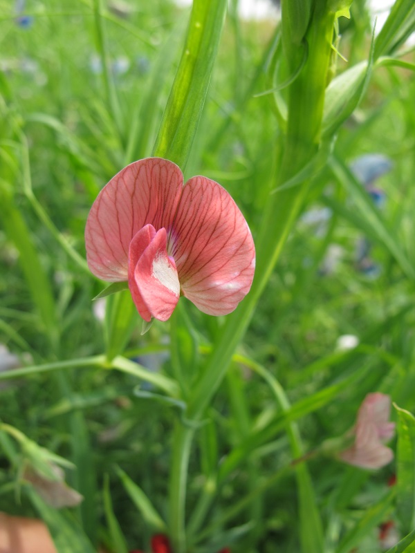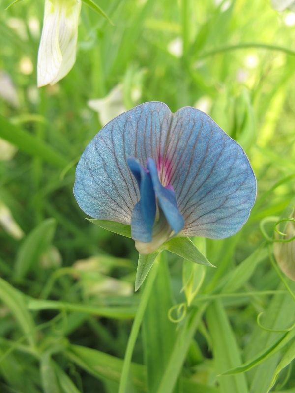 草豌豆花为蝶形花,花色鲜艳,有蓝色、浅红色、紫色或白色。花为腋生的单生花,长约1.5cm,花梗长,旗瓣宽大,翼瓣较短,龙骨瓣白色,雄蕊10个,其中9个连成一体,称二体雄蕊(9+1),花药整齐,花柱匙形,长在雌蕊中间。子房有很密的长柔毛。雌雄同花,自花授粉,开花时间约在上午10时以后,傍晚8时以前闭合。花器中有蜜腺,分泌蜜汁,可诱惑蜜蜂等昆虫前来采蜜,有时也可导致虫媒授粉而杂交。