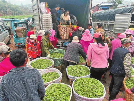 3月23日下午,易门县浦贝彝族乡草箐村鲜食豌豆早蚕豆交易市场刚一开门,从周边村子赶来卖豌豆的农户就急切地涌进了市场。“这筐豌豆真好,饱满又新鲜!”“4块5给卖?”“赶紧抬过来嘛……”空旷安静的市场一下子充实热闹起来。1个多小时后,前来收购豌豆的客商就已收获满满。这些甜脆可口的豌豆,经过分级、装箱、运输等环节后,迅速走向玉溪、昆明、贵州、武汉、长沙等地居民的餐桌。