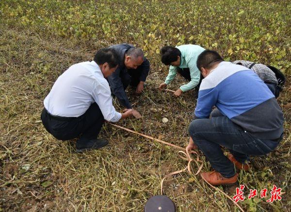 专家现场测算人工收割的绿豆重量。 记者潘璐 摄