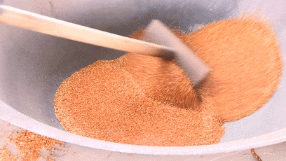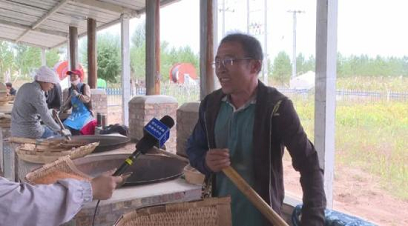 在繁忙的沙拉米炒制大棚内,工人们转动手里的锅铲,香气四溢,不一会儿,一簸箕糜子就炒制好了,可以拿到旁边进行晾晒。